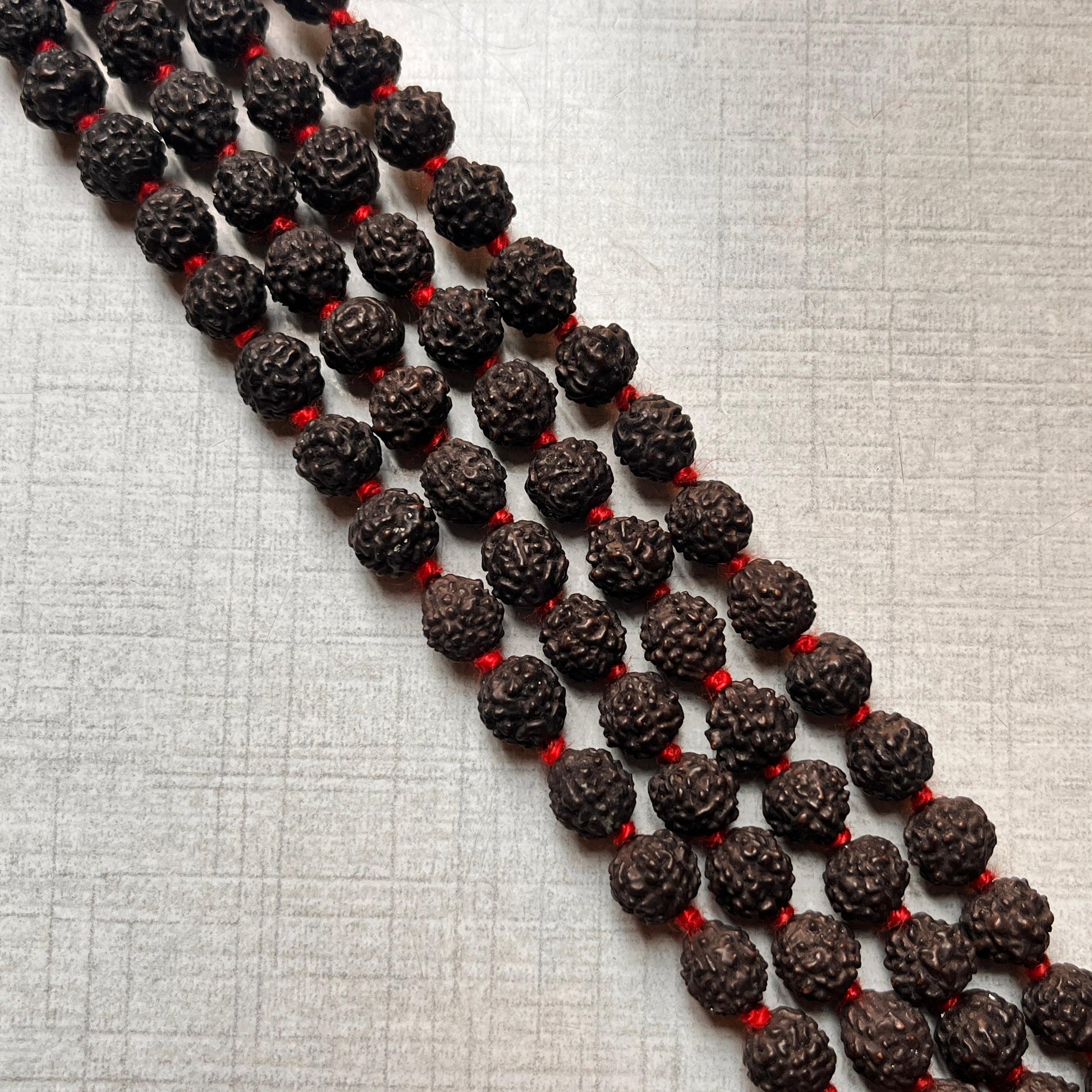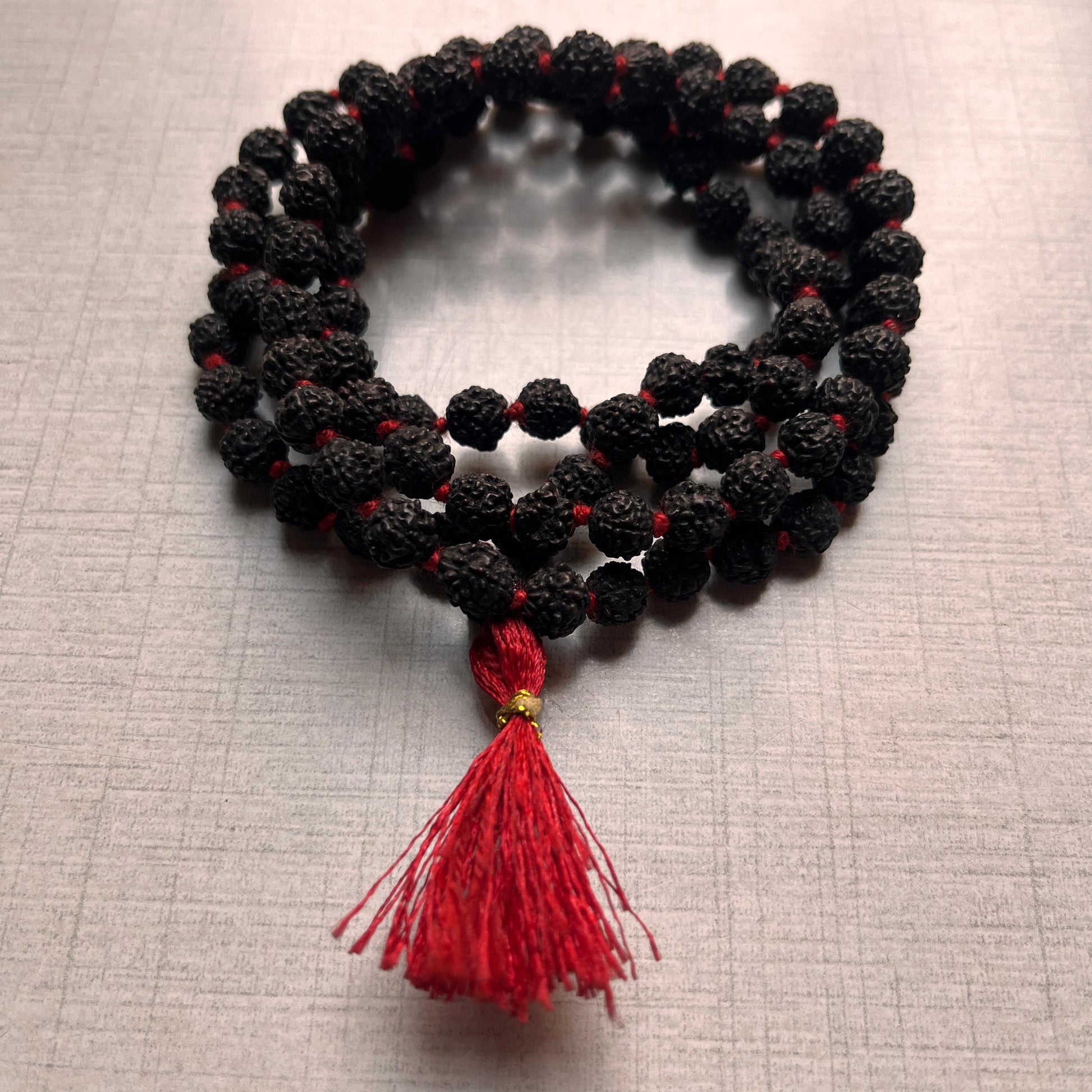 5 Mukhi Rudraksha Jaap & Wearing Mala | 108 Beads, 7mm, Black Colour with Red Tassel