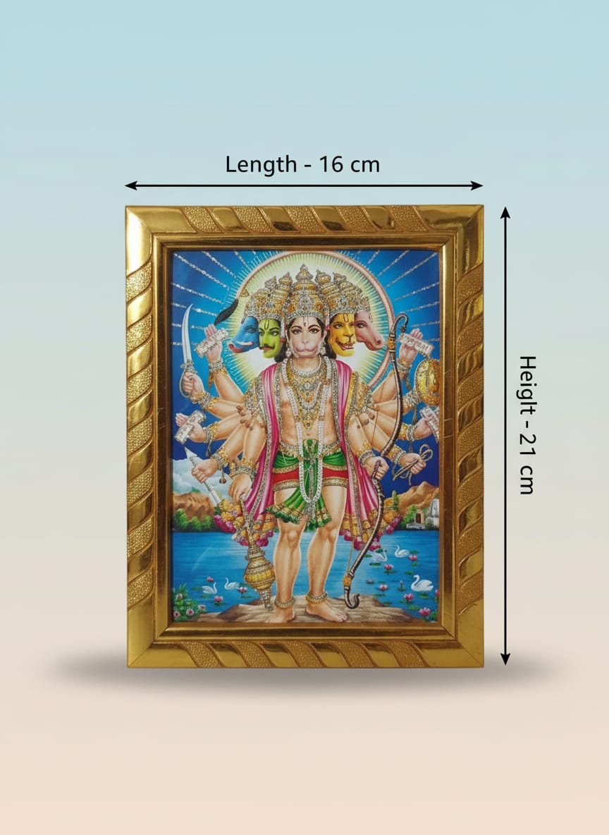 Bring divine protection, strength, and positivity into your space with this Panchmukhi Hanuman Ji Religious Photo Frame. Crafted with premium jari coated acrylic material, this elegant gold-finish frame showcases the powerful Panchmukhi Hanuman Ji, symbolizing courage, devotion, wisdom, and protection from negative energies.